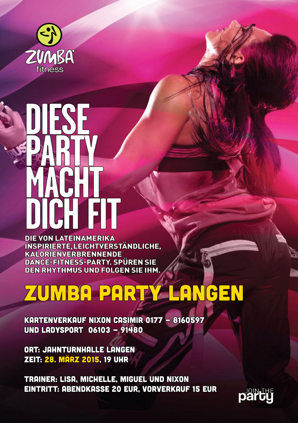 Am 28. März 2015 um 19:00 Uhr findet die nächste Zumba-Party mit Lisa, Michelle, Miguel und Nixon in der Jahnhalle in 63225 Langen statt. Die Eintrittskarten kosten im Vorverkauf EUR 15 und an der Abendkasse EUR 20. Der Vorverkauf findet vor und nach meinen Kursen statt. Freut euch auf ungefähr drei Stunden Zumba-Spass mit uns!